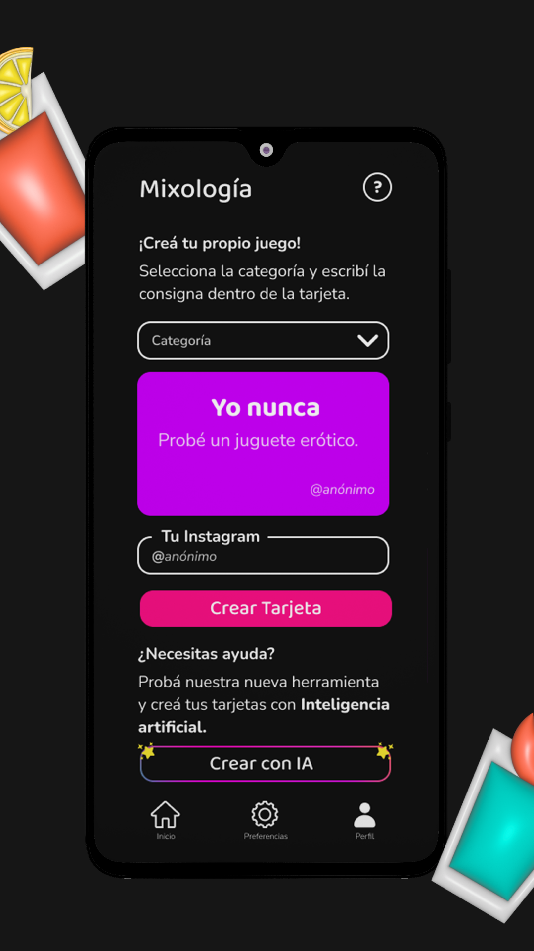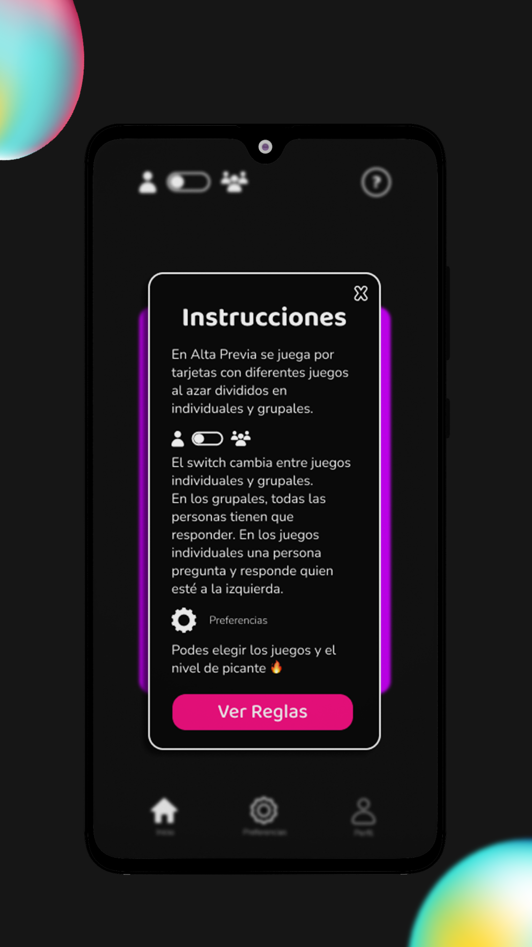Alta Previa es una aplicación móvil de entretenimiento pensada para reuniones sociales, cuya propuesta se centra en juegos interactivos que dinamizan las previas. Incluye dinámicas clásicas como Verdad o reto, Yo nunca y Quién es más probable, además de la posibilidad de personalizar la experiencia creando tarjetas propias de forma manual o con inteligencia artificial.